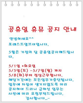 5¿ù¿¬ÈÞ ÈÞ¹« °øÁö ¾È³»ÀÔ´Ï´Ù.^^ FORESTRV ÀÛ¼ºÀÏ : 18-04-27 15:35 Á¶È¸ : 7,047 ¸ñ·Ï 5¿ù ¿¬ÈÞ °øÁöÇÕ´Ï´Ù.^^